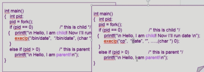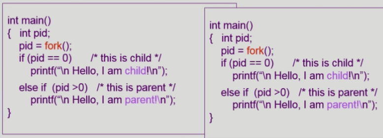 사진에서는 왼쪽 부모 프로세스는 else if(pid>0) 부분의 구문이 실행될 것이고, 오른쪽 자식 프로세스는 if(pid == 0) 부분의 구분이 각각 실행될 것이다.