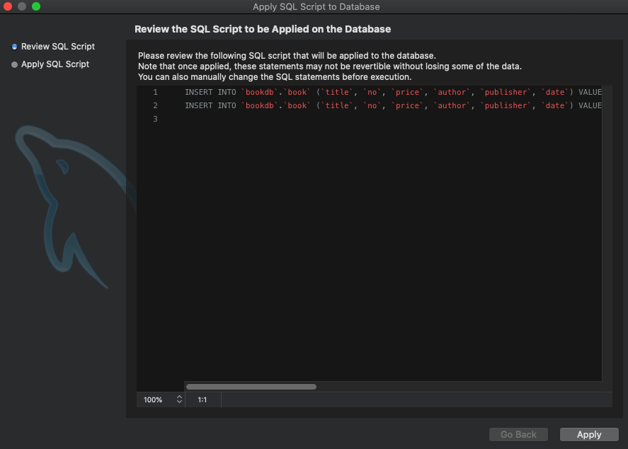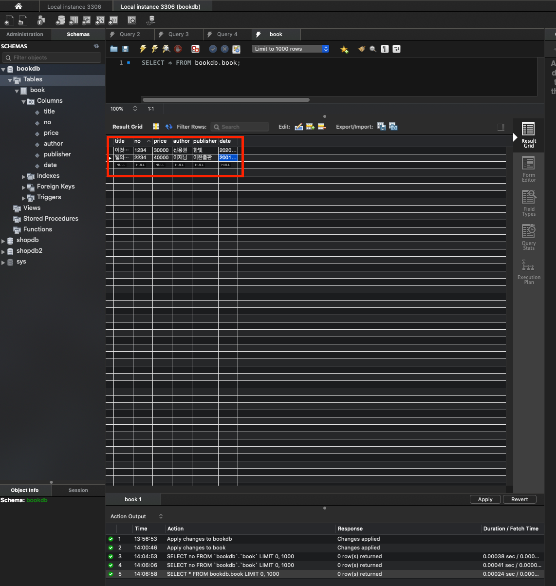 예를 들어, bookdb라는 스키마의 book테이블에 값을 넣고 싶다고 가정해본다.