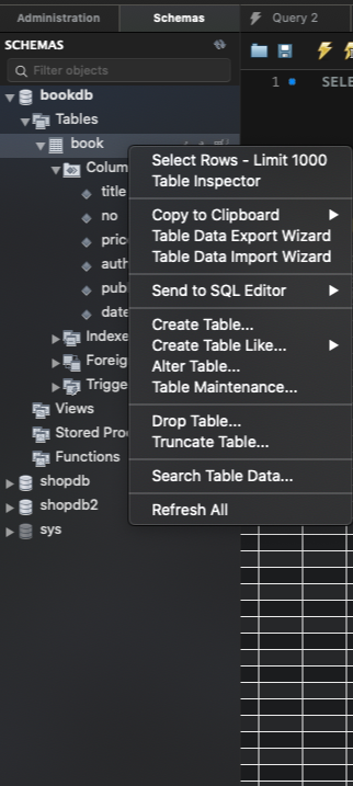 그러면 book테이블을 우클릭한 뒤, Select Rows를 클릭하면 데이터를 입력할 수 있는 격자무늬가 나온다.