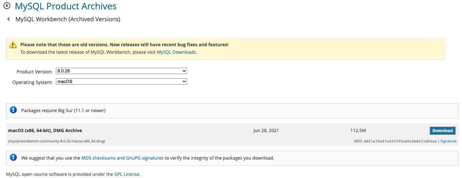 MySQL은 brew나 홈페이지에서 설치할 수 있지만, 그렇게 설치하는 경우에 Workbench를 함께 설치할 수 없어서 직접 찾아서 별도로 설치해주었다.