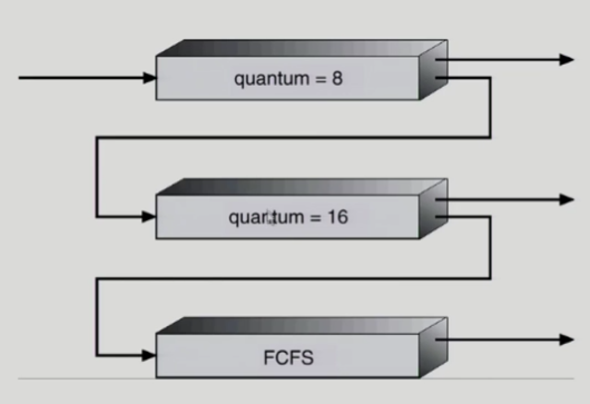 어떤 프로세스든 CPU를 쓰러 들어오면 최고 우선순위 큐에 줄을 선다. 만약 첫 번째 큐에서 라운드 로빈 알고리즘을 사용하여 할당 시간(사진의 예시에서 8) 안에 CPU를 다 쓰면 쓰고 나간다. 반면 할당 시간 안에 다 쓰지 못하면 우선순위가 다음 순위로(사진의 예시에서 16) 하락한다.
