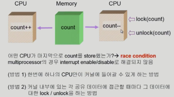 CPU가 2개 이상일 때는, 커널 모드 중 인터럽트를 막는 차원이 아니다. 인터럽트를 CPU 한쪽에서 막았다고 해서 다른 쪽 CPU가 데이터를 사용하는 것을 막을 수 없기 때문이다.