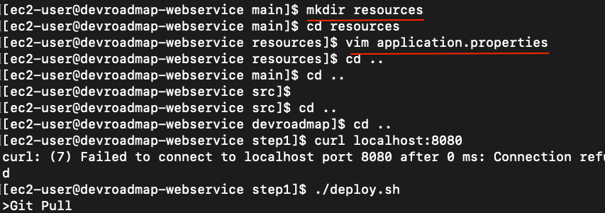 따라서 main 경로 아래에 mkdir명령어로 resources 폴더를 만들고, vim application.properties 명령어로 파일을 생성하여 만들어주었다.